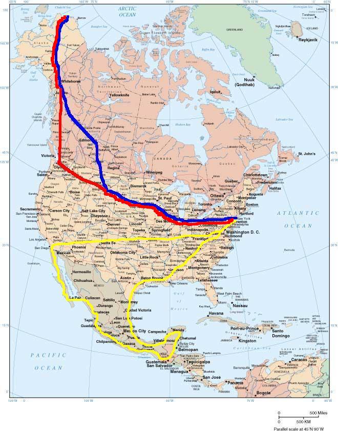 The blue line was my intended route to Prudhoe, Bay Alaska, the red line was the route actually taken to apply for a new passport in Seattle, Washington and the yellow line is my intended motorcycle trip to Mexico.